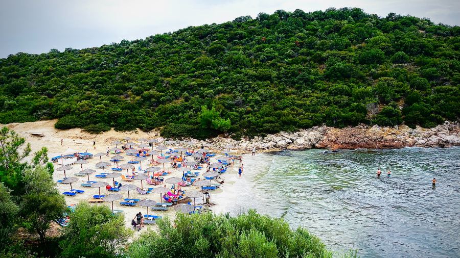 Simos Beach has fine sand, crystal clear water, and since the bay is shallow, it’s an excellent bathing spot for children. It’s not a developed beach, you can’t drive directly to the shore, so you can almost only hear the waves of the sea.