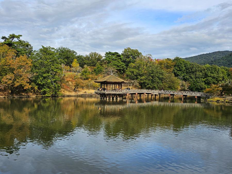 The most beautiful sight in the southern part of the park is the Ukimido Pavilion. This is a small resting area standing on a lake, which can be approached by a wooden bridge. The lake surrounded by yellowing and reddening trees offered a wonderful view.