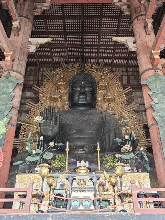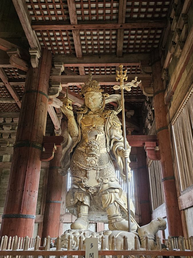 To enter Todai-ji Temple, you have to go through a massive gate, and the impressive building stands in the middle of a small park. There are two types of tickets: 800 yen for just the main temple, 1200 yen including the museum. I only bought a ticket for the main temple. Inside there are several huge statues, including the inevitable Buddha.